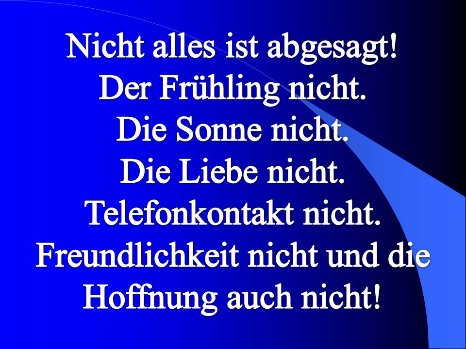 Eins sollten wir aber alle: Wir sollten über Telefon, Briefe oder Internet-Möglichkeiten Kontakt unter einander halten oder aufbauen. Alte und Junge können sich auf diesem Wege, ohne körperlich Kontakt zu nehmen, begegnen und wenn nötig Hilfe organisieren.