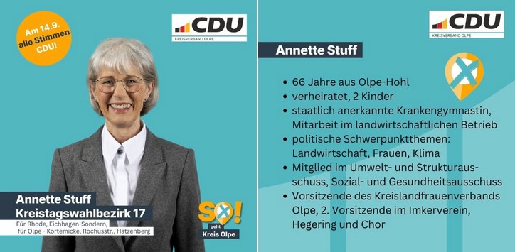 Annette Stuff kommt vom Hof und engagiert sich als Vorsitzende der Kreislandfrauen. Landwirtschaft, Frauen und Naturschutz sind daher ihre politischen Schwerpunkte. Sie hat immer viele gute Ideen, die sie in den Kreistag weiterhin einbringen will.