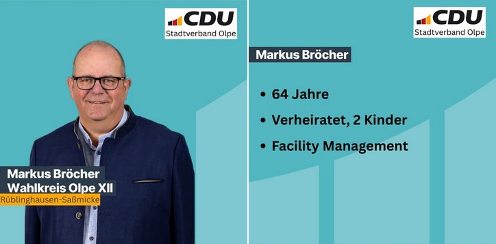 Markus Bröcher hat Ausdauer. Beharrlich kämpft er für Rüblinghausen und Saßmicke. Der stellvertretende Bürgermeister ist in vielen Vereinen aktiv. Besonders viel Arbeit investierte er als Kreisoberst des Kreisschützenbundes Olpe und als stellvertretender Bundesoberst des Sauerländer Schützenbundes in das Schützenwesen. In beiden Verbänden ist er inzwischen als Ehrentitelträger noch aktiv. Durch seine vielen Kontakte kennt er die Probleme des Ehrenamtes und der heimischen Vereine. Besonders die Schaffung neuer Wohnbauflächen in Rüblinghausen und Saßmicke für junge Familien sind in seinem Fokus. Schwerpunktthemen seiner Ratsarbeit sind weiterhin die Sportstätten- und Dorfhäuserförderung sowie die Schulentwicklung