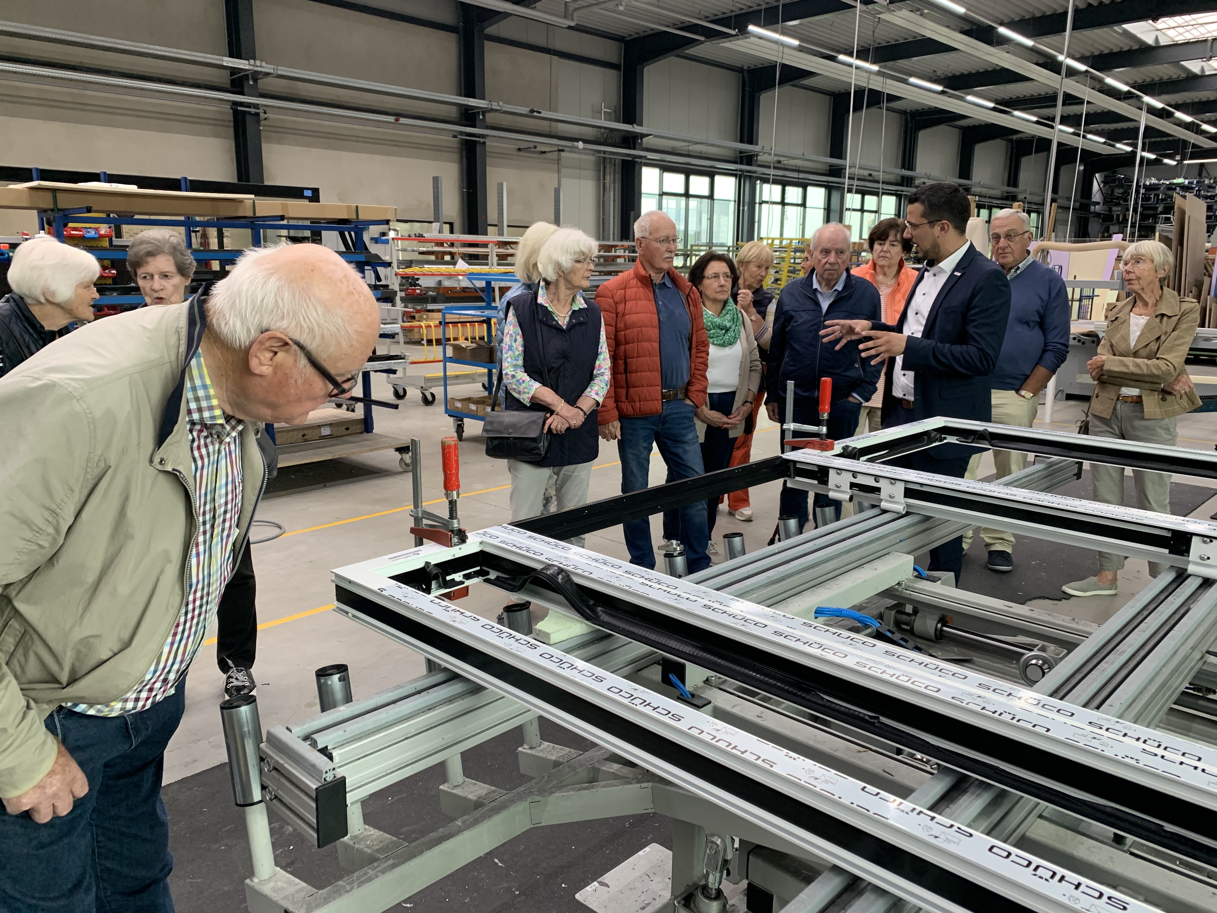 Bei der anschließenden Betriebsbesichtigung wurden unterschiedliche Profile gezeigt als auch entsprechende Dichtungen, Maschinen, die computergesteuert Löcher in die Profile fräsen, verschieden Türfüllungen.