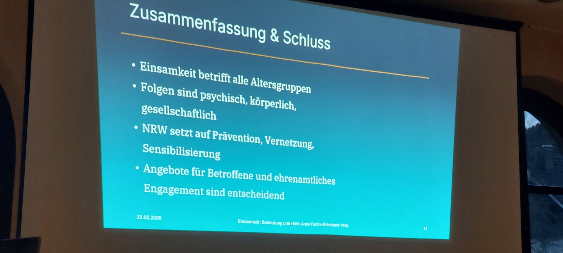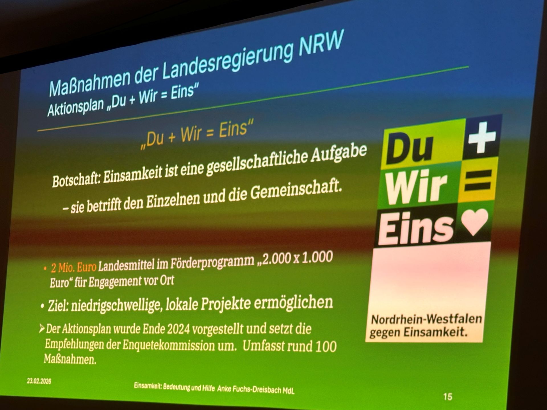 Vor diesem Hintergrund stellte Frau Fuchs-Dreisbach den Aktionsplan „Du+Wir=Eins“ der Landesregierung Nordrhein-Westfalen vor, der bereits 2024 ins Leben gerufen wurde. Über das Förderprogramm „2000 x 1000“ werden zwei Millionen Euro an Landesmitteln bereitgestellt, um ehrenamtliches Engagement vor Ort zu stärken und lokale Projekte zur Bekämpfung von Einsamkeit zu ermöglichen. Damit setzt die Landesregierung Empfehlungen der Enquetekommission NRW um. Bislang wurden rund 100 Maßnahmen realisiert.
